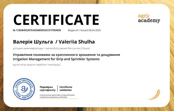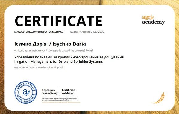 Здобувачки другого (магістерського) рівня вищої освіти за спеціальністю «Агроінженерія» Дар’я Ісичко та Валерія Шульга в межах неформальної освіти на онлайн-платформі AgriAcademy успішно опанували курс «Управління поливами за краплинного зрошення та дощування».
