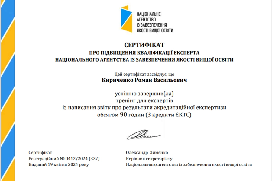18 та 19 квітня 2024 року доцент кафедри СГМ та ІТ Кириченко Р.В. приймав участь у тренінгу для експертів НАЗЯВО, присвяченому складанню звіту про результати акредитаційної експертизи. Для участі у тренінгу необхідно було виконати домашнє завдання з аналізу реальної акредитаційної справи.